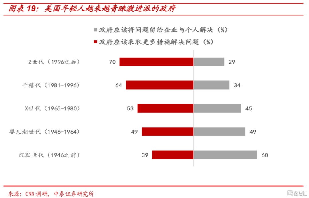 拜登今年相对激进的竞选纲领,本质上也是,伴随美国族群结构和年龄结构的改变,疫情之后,主张大政府、社会保障、政治正确的民主党激进派声音越来越大的反映。70%的美国95后年轻人认为政府做的还不够,持相同观念的60后仅有50%。今年年中举行的议员选举中,桑德斯为代表的激进派一举拿下六个选区,而在任的民主党大佬纷纷落选。