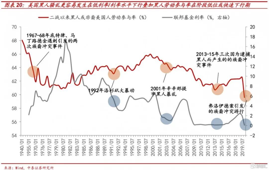 但实际上,美国族裔矛盾的深层次原因在于贫富分化,而非政治上的歧视。在60年代平权运动之后,黑人政治地位大幅提升,其也拥有了投票权、选举权在内的各项选举权力,且在法律上亦享有各种保护。但经济上,不同族裔的处境和地位的分化却不断加剧。根据美国人口普查局2012年的报告,黑人的贫困率为27.6%为白人两倍,黑人16-24岁青年男性的贫困率为34.5%,为全美贫困率的三倍,而其儿童的贫困率更是达到38.2%。我们统计研究发现,二战后,美国五次大规模的族群骚乱的宏观背景的共性在于:低利率/利率下行下,资产价格与劳动力,特别是特定族裔年轻男性劳动力的就业出现持续分化和偏离。
