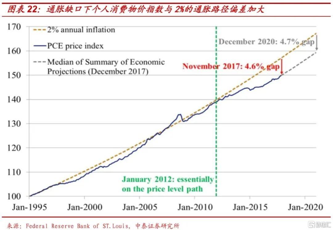 1)从经济角度看, 2012年以来,美国以个人消费价格指数(PCE)衡量的通胀水平一直持续低于美联储预设的2%的目标值(目前实际价格路径与2%的价格路径之间的偏离已扩大至4.7%),这一目标反映的是美联储促进就业最大化能力。持续存在的通胀缺口拉低了家庭、企业部门的通胀预期,这将抑制产出和总需求向潜在水平靠拢,并推升了股市、汇率等资产价格波动率。