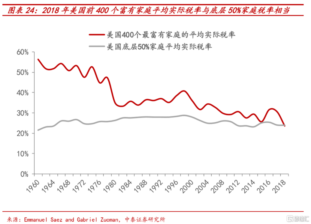 美国的财政问题究其根源是:过去四十年全球化下,跨国企业和富裕阶层的多重避税,使得政府税收获取能力大为降低。跨国企业及高管在全球化过程中攫取大量利益的同时,通过各国子公司间复杂的关联交易使得在母国的应税收入减少,将利润尽可能转移到税率更低的国家,从而实现合理避税。2018年,美国400个最富有家庭的平均实际税率为23%,比美国底层50%家庭的24.2%还低了一个百分点。换言之,富裕阶层在享受到全球化红利下,却拒绝承担相关的责任。美国财政问题也是贫富分化加剧下的另一种体现。