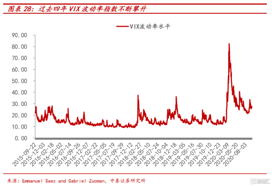 若特朗普成功连任,考虑到其在竞选纲领,继续强化以关税、贸易保护为主要措施的美国优先策略是其最核心的竞选承诺。可以预见,特朗普的第二任期中,不仅对华贸易摩擦等仍会不断加剧,而且美国与欧洲等盟国的不信任亦会与日俱增,甚至二战以来美国所主导的世界秩序、盟国体系都有分崩离析的风险。国际现有秩序崩坏的过程中,各类地缘风险和冲突亦是集中爆发、层出不穷,全球资本市场波动率亦显著提升,事实上过去四年中,全球市场波动率已不断攀升至与2008年水平相当,2020年4月VIX波动率(恐慌指数)达到84.8。