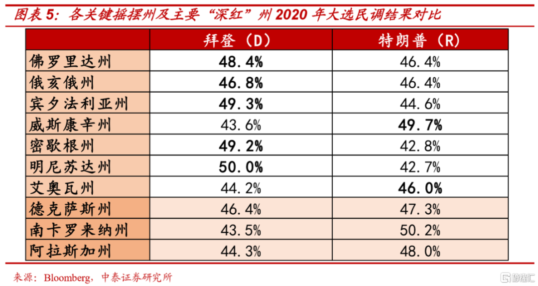 我们统计了佛罗里达、俄亥俄、宾夕法尼亚、威斯康辛、密歇根、明尼苏达、艾奥瓦等十余个关键摇摆州的最新民调情况,拜登几乎在上述主要关键摇摆州保持着3-4%的领先优势,如:在有着20张选举人票,被视为共和党总统候选人要想成功就必须拿下的宾夕法尼亚州,特朗普目前仍与拜登有着4%以上的差距。在摇摆州中选举人票数最多(29张),历次大选争夺最激烈的佛罗里达州,拜登领先特朗普幅度仍为2%。由于上述关键摇摆州涉及的选举人票总和达到111张,占全国选举人票比例超过20%。关键摇摆州的大面积落后,显然靠辩论、演讲等短期冲刺是难以弥补的,这意味着除非未来1-2个月发生“黑天鹅”等小概率事件,否则特朗普几乎无法连任。