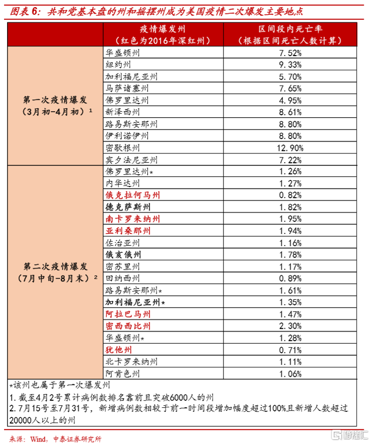 上述深红州的“褪色”有美国人口结构变化的中长期因素,但特朗普在疫情中一系列突破下限的操作给美国和共和党选民带来深重的灾难则是导致特朗普基本盘分崩离析的直接原因。如图表所示,例如,由于听信了特朗普不带口罩,病毒无害等言论而疏于防控,与美国疫情第一轮爆发主要在纽约等民主党控制的大城市相比,自7月以来,德克萨斯、佛罗里达等为代表的共和党政府控制的各州成为美国疫情二次爆发主要地点。