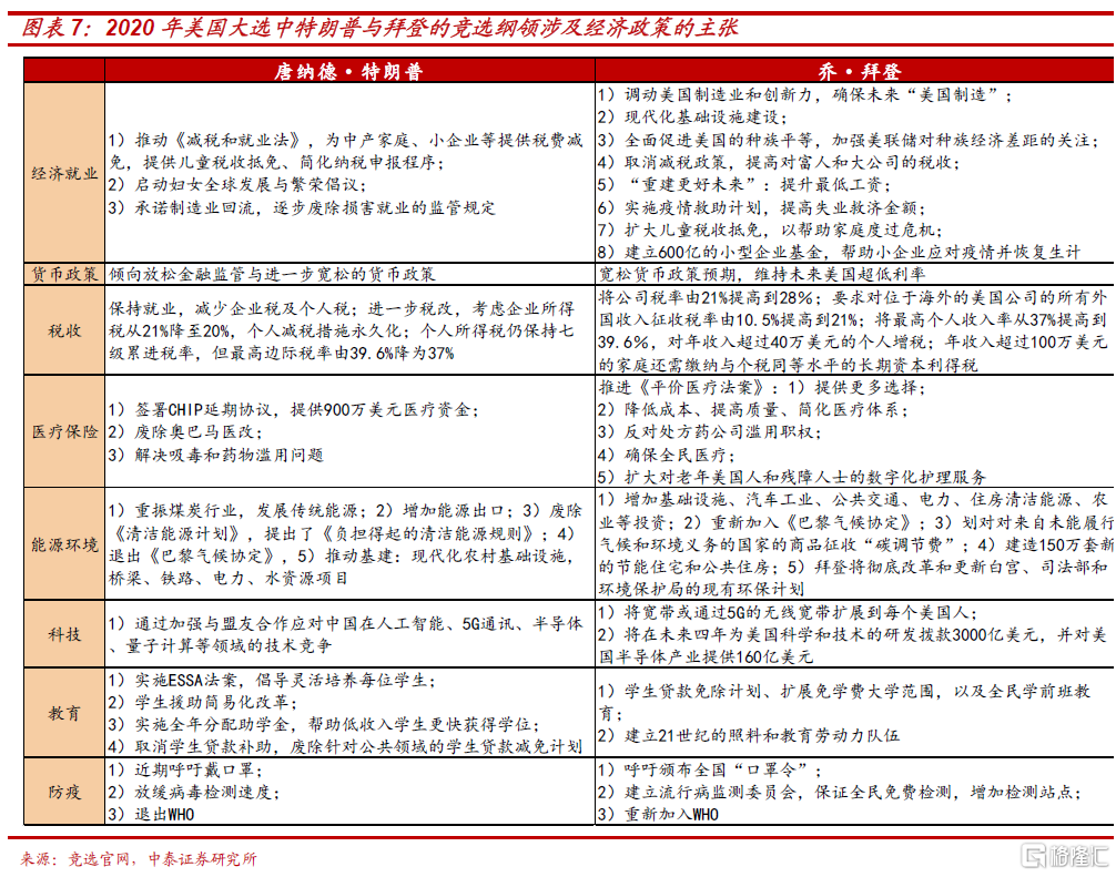 在依据多维度数据对美国大选客观分析之后,接下来我们将分析市场最为关心的:大选后对美股,乃至于全球资产价格走势的可能影响。而分析大选对美股的影响,首当其冲的是分析拜登和特朗普两位候选人国内经济政策的差