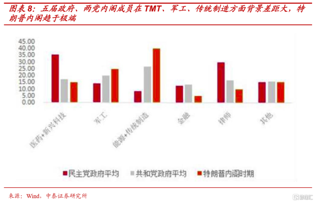 就科技及产业政策而言,首先,由于两党的基本盘差异,对于不同的科技及产业的态度,两党传统上就是泾渭分明的:共和党注重传统能源、制造、军工,民主党更加倾向新能源、医药生物、TMT等硅谷新兴产业。通过比较过去40年,五任总统内阁成员在履新前的履历,平均而言,民主党内阁,医药及TMT背景占比(35.83%)超过共和党内阁(占比17.41%)1倍以上。而能源+传统制造背景占比则恰好相反,平均而言,共和党内阁占比(26.88%)是民主党内阁(占比8.33%)的3倍以上。