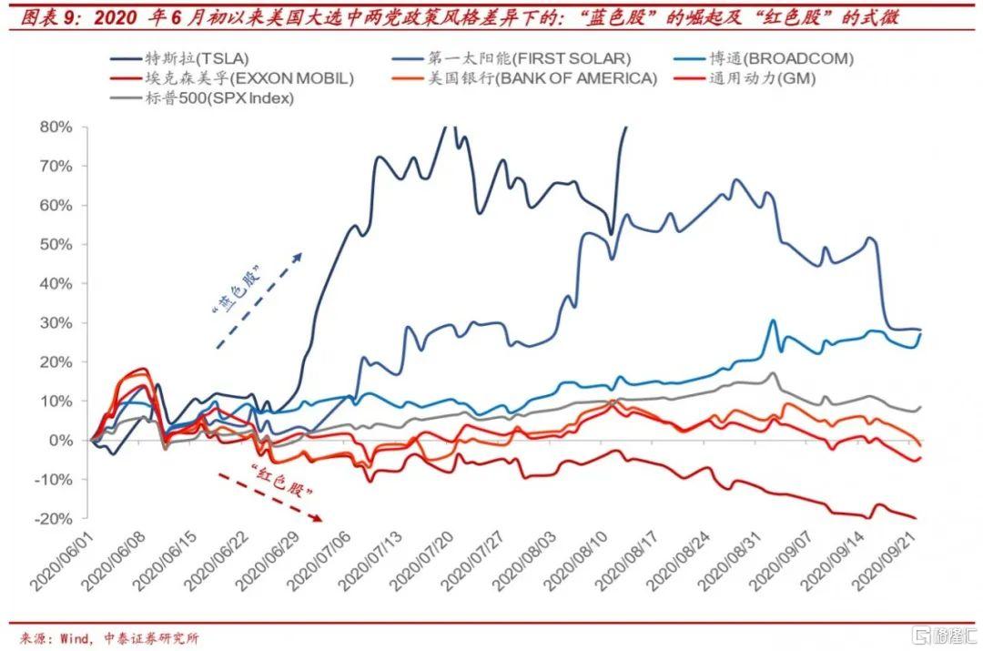 事实上,伴随大选的临近与拜登相对较大的竞选概率,近期美股结构上已经开始在逐步反映拜登当选的前景:根据CNN Business分享的数据,自6月初以来,一批涉及可再生能源、支持全球化、医疗保健等的所谓“拜登股”或称为“蓝色名单”的股票(包括:特斯拉、第一太阳能、芯片巨头博通)上涨超过10%。与此同时,“特朗普股”或称“红色名单”股(主要是一些石油和化石燃料生产商、大型国防承包商和银行股等)在过去三个月里平均下跌了9%。
