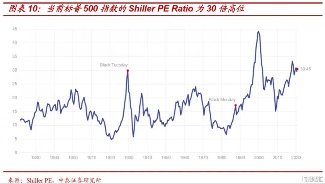 第一,从估值与业绩角度看,过去四年美股上涨过程中,标普500企业为代表的企业盈利增长的贡献占比仅为20.38%(我们接下来会强调这仅有20.38%的盈利增长贡献中又是以政策驱动的减税与回购为主,而非企业真正的内生增长),而估值的贡献却高达77.62%。当前标普500估值(按通胀率调整过去十年的利润与股价相比)为30.45已经与大萧条前的历史极值水平相当。