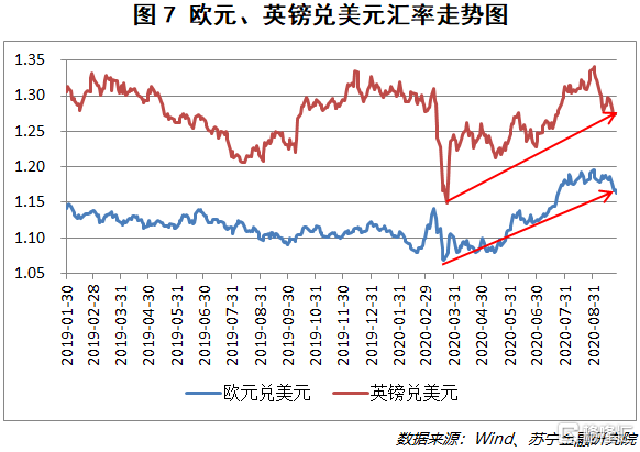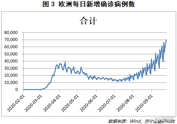 8月以来,欧洲每日新增确诊病例数快速上升,不断刷新历史记录(见图3),这也是近期欧洲股市持续下跌的直接导火索。以9月25日为例,全欧洲每日新增确诊病例数超6.9万,是9月初的2.3倍,且仍呈加速增加的趋势,其中比利时每日新增确诊病例数较月初增加8.7倍,英国增加4.2倍,法国增加2.2倍。疫情再次失控的主要原因是,夏季欧洲内部的跨境旅游管理放松、假期结束学校重开、社交活动活跃导致病例数激增。