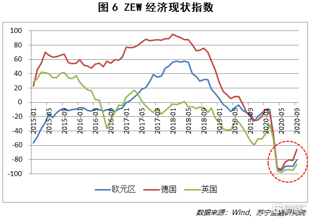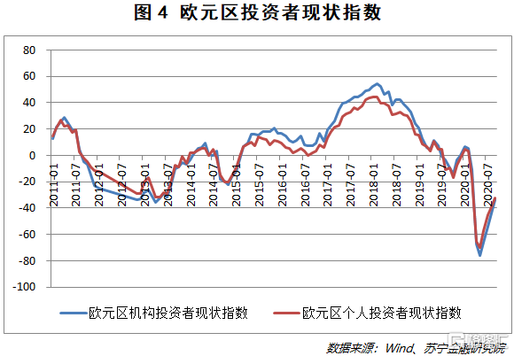 立场的不一致使得欧盟的救助计划异常难产,在缺乏货币与财政政策自由度的情况下,欧盟各国的经济复苏极度缓慢,资本市场的信心受到严重挫伤(见图4)。尽管欧洲央行已经紧急将购债规模扩大至1.35万亿欧元,欧盟也出台了7500亿欧元的复苏基金,但当疫情再次袭来,市场有理由担心进一步的救助计划难以及时、有效地实施。截至9月份最新数据,机构投资者和个人投资者均未对欧元区经济产生乐观的态度。