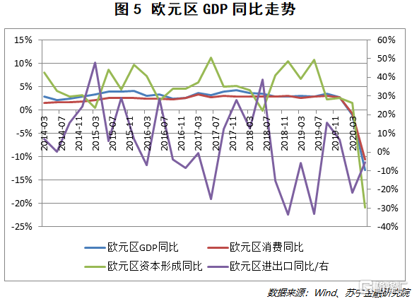 在年初疫情发生之后,欧洲的经济复苏就凸显疲软。从整个欧元区来看(见图5),二季度的GDP同比下降13%;分结构来看,消费和投资迅速萎缩,消费者信心和投资者信心均受到严重打击,净进出口虽然相较一季度封城时有所修复,但仍未实现转正。