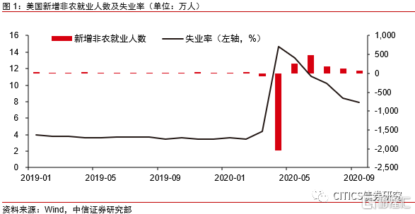 9月数据不及市场预期,非农新增少于一百万人。从非农就业人数变化来看,9月季调后非农就业人口新增66.1万人,预期增85万人,前值增137.1万人。9月非农新增就业人数降至一百万人以下,明显低于前值及市场预期。9月失业率为7.9%,预期为8.2%,前值为8.4%。从非农新增就业人数的情况来看,,9月份非农数据更是进一步体现出就业改善放缓这种趋势。而从失业率的情况来看,9月美国失业率较前值下降约0.5个百分点。9月失业率下降主要是由于很多人将自己归类为“被雇佣但却没有去工作”,但是我们同时应注意到,今年3月至8月,美国劳工统计局都会公布一个计算了错误分类工人在内的失业率估值,因此9月真实的失业率数字实际上可能会略高于非农报告当中的数据。而在失业率下降的同时,美国劳动参与率也下降了0.3个百分点,这表明虽然失业率可能有所下降,但一些人正滑向长期失业,或与劳动力市场脱节。对于美国就业市场来看,美国就业市场改善速度仍处于持续放缓的过程当中。