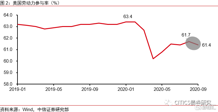 劳动参与率继续降低,永久性失业仍旧严重。9月美国劳动力参与率为61.4%,相较上月的61.7%进一步下滑约0.3个百分点。在疫情爆发之前,美国1月和2月的劳动力参与率约为63.4%,疫情发生后这一指标已下滑约2个百分点,这表明疫情发生后大量劳动力人口淡出了美国求职市场,这对于美国的整体就业而言是一项隐忧。同时我们在《美国2020年8月非农数据点评—非农略高于市场预期,后续两个要点值得关注》(2020-9-5)当中还提示了当前美国就业市场存在的结构性问题,即永久性失业人数的上升。美国9月份永久性失业人数录得375.6万人,相较8月份341.1万人仍在继续增加,永久性失业问题仍旧严重。