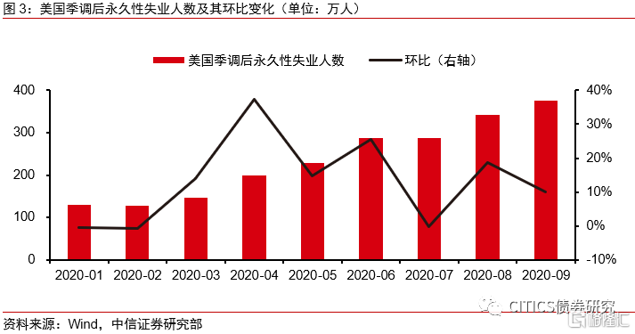 9月美国劳动力参与率为61.4%,相较上月的61.7%进一步下滑约0.3个百分点。在疫情爆发之前,美国1月和2月的劳动力参与率约为63.4%,疫情发生后这一指标已下滑约2个百分点,这表明疫情发生后大量劳动力人口淡出了美国求职市场,这对于美国的整体就业而言是一项隐忧。同时我们在上月的点评当中还提示了当前美国就业市场存在的结构性问题,即永久性失业人数的上升。美国9月份永久性失业人数录得375.6万人,相较8月份341.1万人仍在继续增加,永久性失业问题仍旧严重。