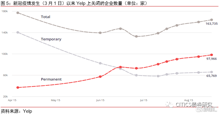 政府刺激措施减弱,关注企业破产和裁员情况。对于当前的美国就业市场,我们认为值得注意的一项是企业的生存情况。当前美国新一轮政府刺激政策迟迟缺位,上月美联储主席鲍威尔在向美国国会作证时表示,未来的道路仍然“高度不确定”,将“取决于保持对病毒的控制,以及各级政府采取的政策行动”,而在政府刺激措施减弱的背景下,美国企业所面临的情况变得更加严峻。9月美国挑战者企业裁员人数报11.9万人,企业裁员人数在8月出现下降后又再次有所提升。另一方面,根据美国破产法庭数据公司Epiq AACER公布的数据显示,9月的前25天,至少有620家公司申请了美国《破产法》第11章的保护,而6月和7月申请破产的企业数分别为609家和644家;而根据美国最大点评网站Yelp发布的数据,自新冠疫情发生以来,截止到8月31日,在Yelp上共有163735家美国企业关门,全国范围内的永久性和临时性关闭都在增加,其中有97966家关闭企业没有重新开放。因此当前美国企业的破产和裁员情况是值得关注的,在政策缺失的背景下,一旦美国中小企业破产加速,失业的风险可能会再度升温。
