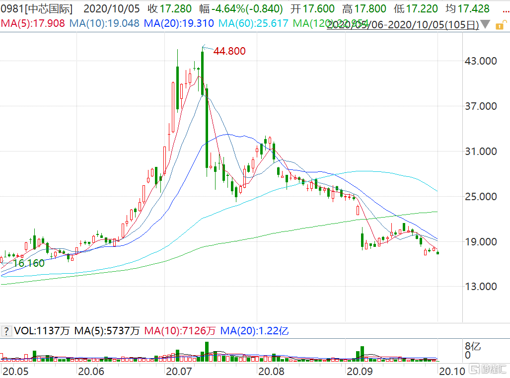 格隆汇10月5日丨中芯国际(0981.HK)低开低走,盘中跌幅一度扩大至4.97%报17.22港元,成交额放大至2亿港元,市值2090亿港元。中芯国际目前价格较今年7月15日创出的最高价44.8港元已下跌超60%。公司证实遭美国出口限制,称预计美国出口限制对于未来的生产经营可能会产生重要不利影响。