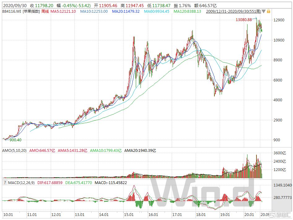 A股方面,近些年,苹果概念指数一直震荡向上。截止9月30日,苹果指数今年上涨21.77%。目前基本处于历史高位。