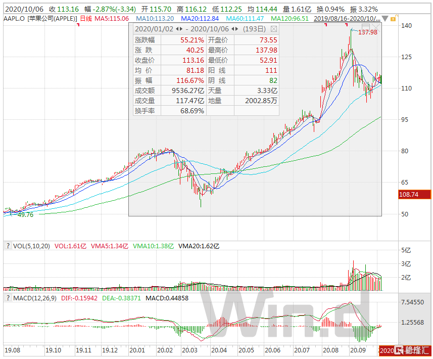不过iPhone 12即将发布的消息在凌晨出来后,10月6日,苹果股价却表现一般,虽然有小幅拉抬动作,最终还是跟随大盘大跌,最终收跌2.87%。