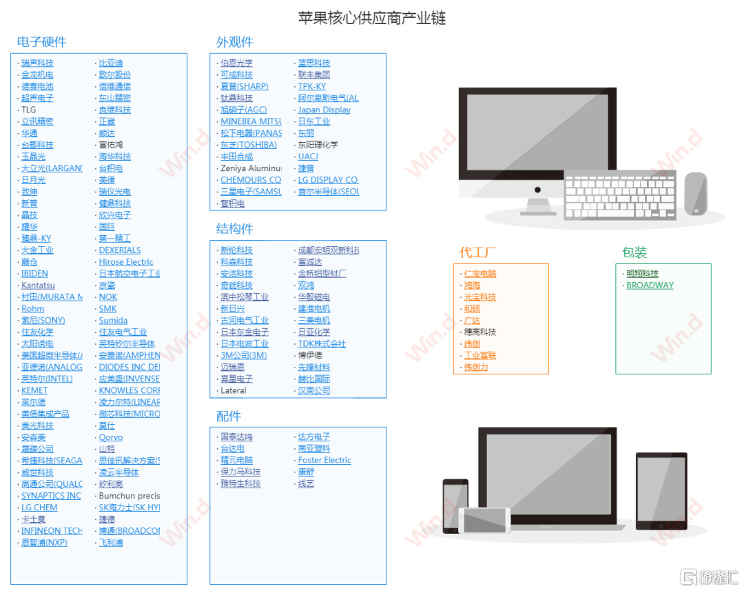 据Wind产业链平台,苹果核心供应商产业链如下: