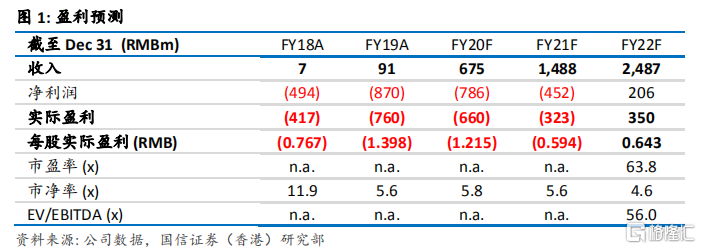 基于近期业务进展,我们微调盈利预测,预计公司 20-22 财年总收入将分别为人民币 6.75 亿/14.88 亿/24.87 亿元,同比增长率为 642.3%/120.4%/67.2%;同期核心利润分别为人民币-6.61 亿/-3.23 亿/3.50 亿元。我们微调现金流折现法(WACC=10.2%, g=3.0%) 所得目标价至 73.60 港元,维持“买入”评级。