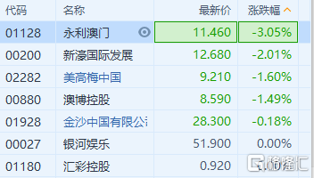 港股异动丨濠赌股延续跌势 永利澳门(1128.HK)跌逾3%领跌