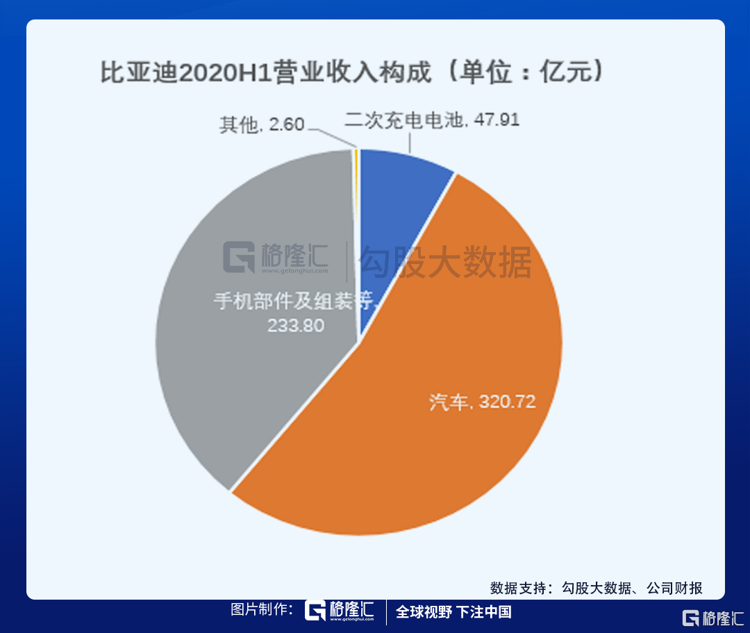 从上半年中报数据看,2020年上半年,比亚大汽车的收入为320.72亿元,占比超过一半,手机部件及组装等的收入约为233.80亿元,约占四成,电池的收入为47.91亿,约占到总营收的8%。