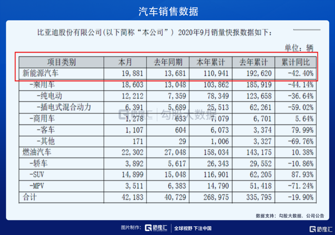 从汽车销量上看,比亚迪前三季度汽车销售仍然是同比下滑的,公司2020年前三季度累计销售为33.58万辆,同比下滑19.90%,其中新能源汽车同比下滑42.40%,不过在燃油汽车方面,我们看到累计同比是上升了10.38%。
