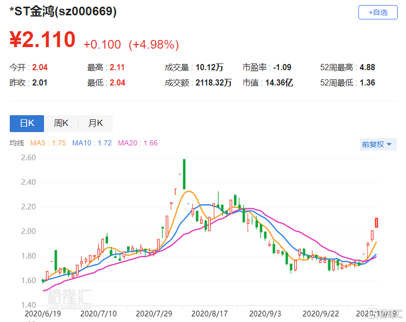 格隆汇10月19日丨*ST金鸿(000669.SZ)连续第四日涨停,报2.11元,买一封单近2万手,最新总市值14.36亿元。*ST金鸿上周披露了2020年前三季度业绩预告,预计前三季度实现归属于上市公司股东的净利润2.5亿元-3亿元,上年同期为亏损2.46亿元。其中,预计第三季度实现归属于上市公司股东的净利润4.28亿元-4.78亿元,上年同期为亏损7703.39万元。