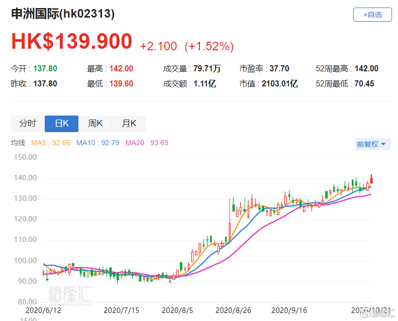 格隆汇10月21日丨申洲国际(2313.HK)涨1.52%,报139.9港元,盘中高见142港元再创历史新高,年内涨幅达25%,有望连续第六年录得上涨,总市值2103亿港元。