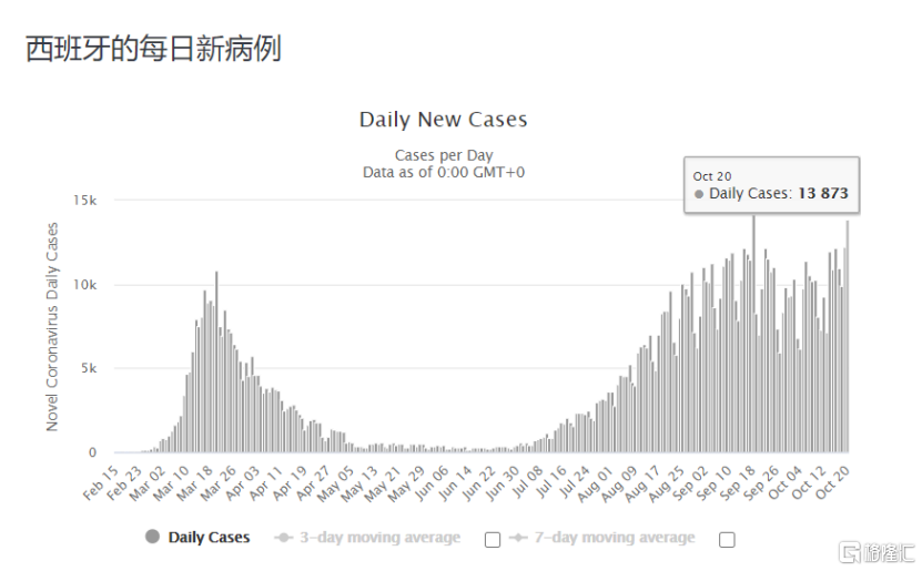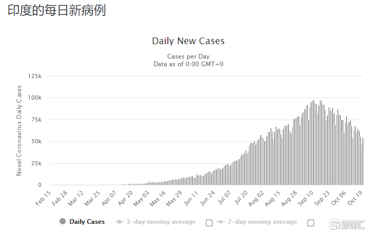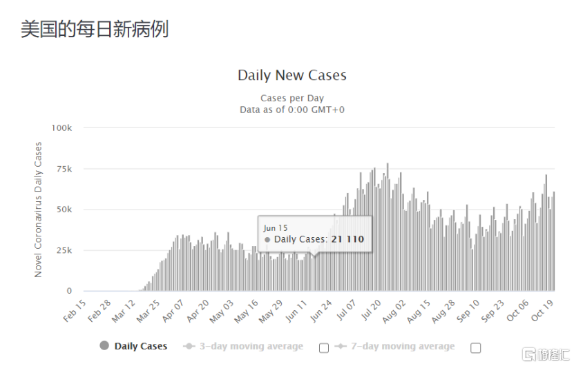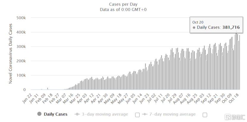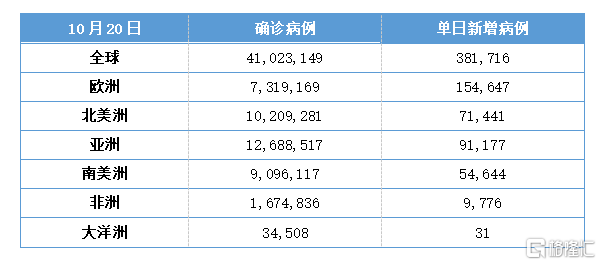 纵观全球,全球疫情持续发展,每日新增确诊病例数仍旧居高不下。昨日10月20日,全球单日新增病例高达38万人,并且增速有持续增加的势头。