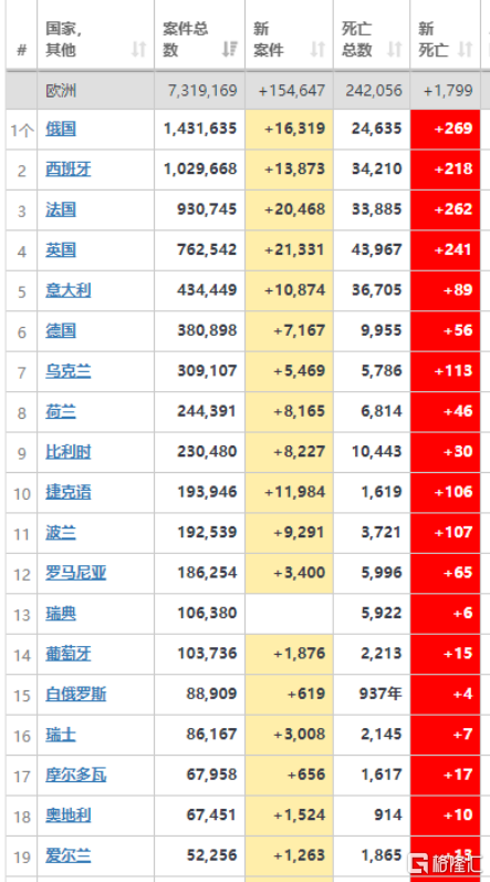 其实,从五大洲各国的数据来看,除了欧洲是有众多国家每日新增病例增幅逐步加大,其他五大洲的很多国家每日新增病例的人数并不明显。