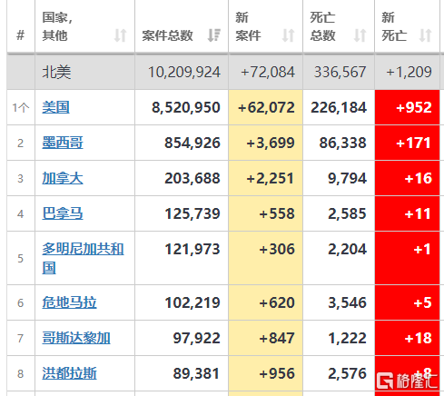 具体来看美国,截至北京时间10月21日19时,美国累计确诊新冠肺炎病人数全球最高,达852.08人,死亡人数22.62万人。