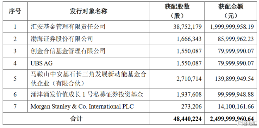 格隆汇 10 月 26日丨亿纬锂能(300014.SZ)披露向特定对象发行A股股票发行情况报告书,根据投资者申购报价情况,并严格按照认购邀请书中确定的发行价格、发行对象及获配股份数量的程序和规则,确定本次发行价格51.61/股,发行股数4844.0224万股,募集资金总额约25亿元。此次发行对象最终确定为7。此次发行配售结果如下: