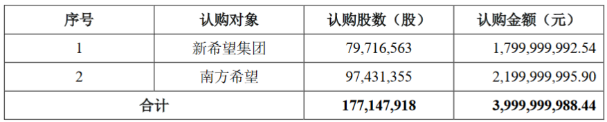 此次非公开发行的发行对象为公司控股股东新希望集团及其控制企业南方希望共2名符合中国证监会规定的特定对象,采用定价发行的方式,发行对象均以现金认购。各发行对象认购情况如下: