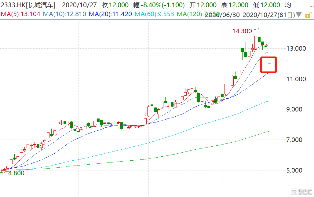 格隆汇10月27日丨上周五晚公布业绩的长城汽车(2333.HK)低开8.4%报12港元,A股昨日收跌3.93%报23.97元。财报显示,长城汽车前三季度营收约621.43亿元,同比减少0.69%;归属于上市公司股东的净利润25.87亿元,同比下降11.32%。其中,三季度营收262.1亿元,同比增23.6%,归母净利润14.4亿元,同比增2.9%。野村指其季度业绩逊预期,维持减持评级,目标价6.9港元。