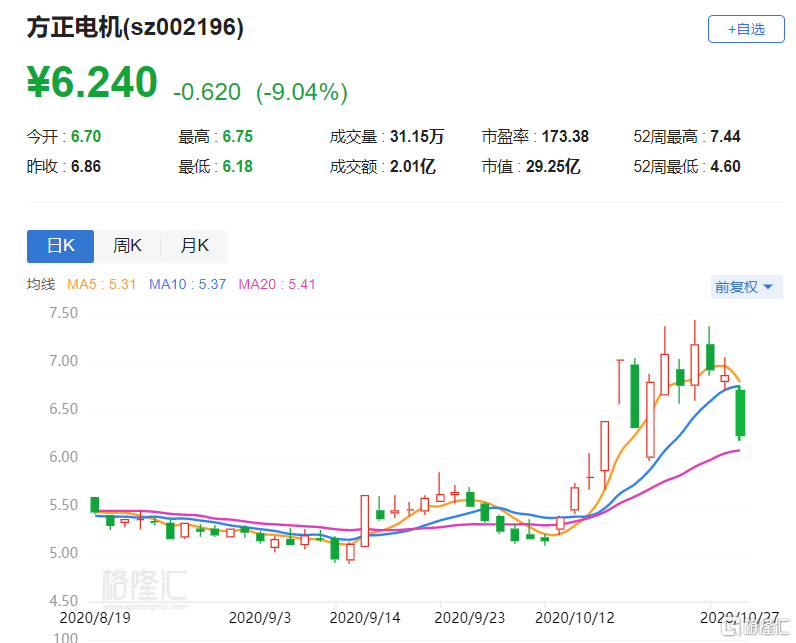 格隆汇10月27日丨方正电机(002196.SZ)低开低走,现逼近跌停,现报6.24元,总市值29亿元。