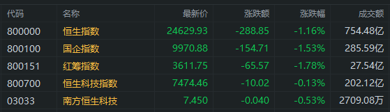 港股上午盘主要指数均收跌,恒指跌1.16%报24629点,恒生科技指数冲高回落跌0.13%。南下资金半日净流入49.65亿港元,大市成交额为754亿港元。
