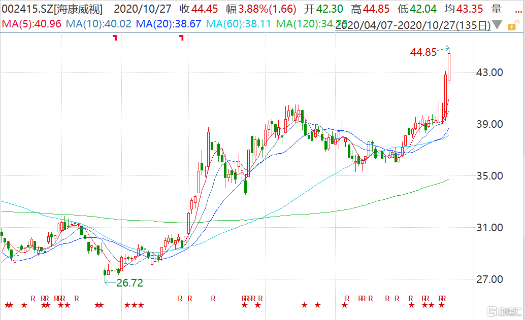格隆汇10月27日丨昨日逼近涨停的的海康威视(002415.SZ)今日继续上涨,盘中一度涨4.81%报44.85元,暂成交21.33亿元,最新总市值4191亿元。海康威视第三季度净利润为38.15亿元,同比增长0.12%。三季报显示,高毅资产冯柳管理的高毅邻山1号远望基金新进十大股东,持股数量2.31亿股,持股比例2.47%,估算其第三季度至少买入海康威视2%股份。以23日海康威视收盘价39.15元/股估算,高毅邻山1号远望基金持有海康威视市值约90亿元。