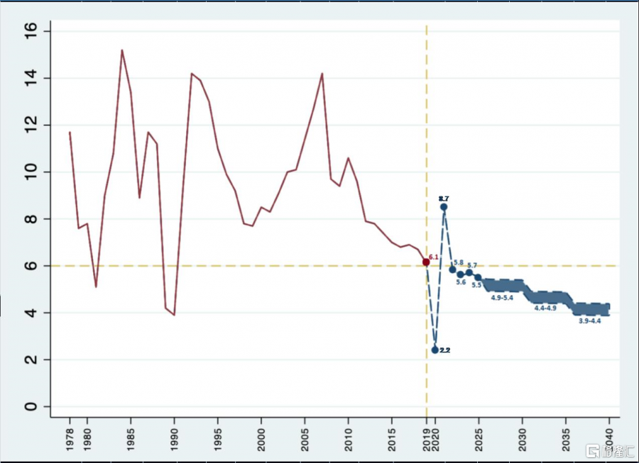 图1  中国GDP增长-过去40年(实际)与未来20年