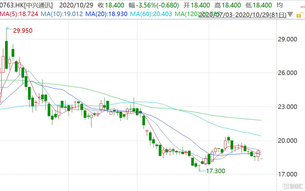 中兴通讯(0763.HK)低开3.56% 第三季度净利下降68%