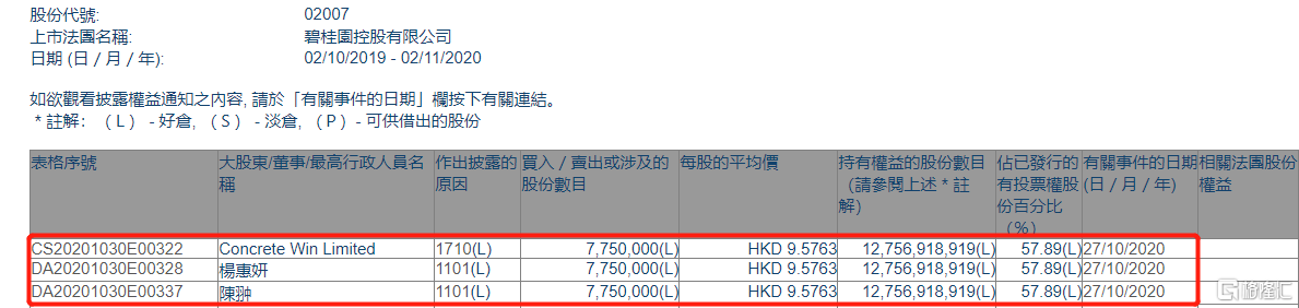 格隆汇APP获悉,根据联交所最新权益披露资料显示,2020年10月27日,碧桂园(02007.HK)获执行董事兼联席主席杨惠妍在场内以每股均价9.5763港元增持775万股,涉资约7421.63万港元。