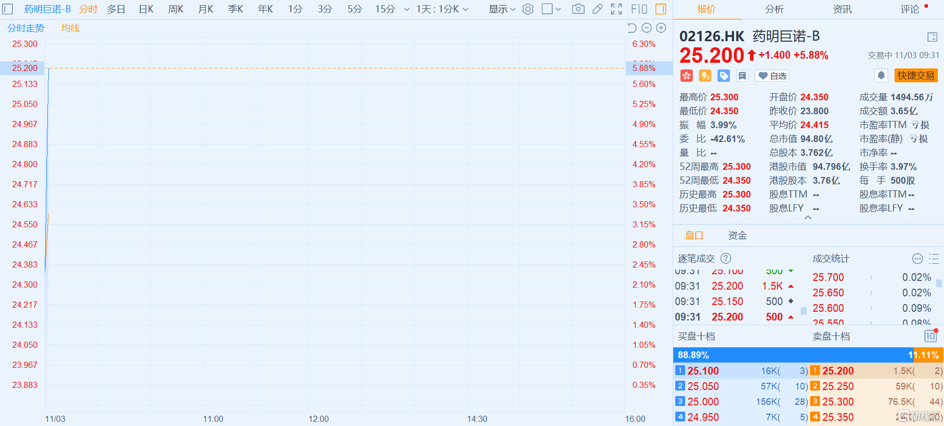 格隆汇11月3日丨药明巨诺-B(2126.HK)首日挂盘开报24.35港元,较招股价23.8港元高2.3%,成交额2.9亿港元,盘初涨幅扩大至近6%,报25.2港元,总市值95亿港元;每中签一手浮盈700港元。药明巨诺是中国领先的临床及临床前阶段细胞治疗公司,也是国内首个获得以CD19为靶点的CAR-T细胞治疗产品IND临床批件的企业。此次上市拟全球发售9769.2万股,其中香港发售4884.6万股,国际发售4884.6万股,每手500股,中签率5%,香港公开发售获449.42倍认购,净筹21.967亿港元。在过往融资记录中,公司获得淡马锡、红杉等知名投资机构的青睐。