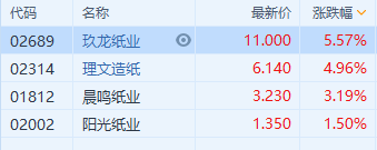 港股异动 | 纸业股全线上涨 玖龙纸业(2689.HK)涨超5%领涨