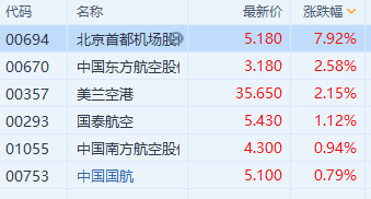 港股异动 | 航空股全线上涨 北京首都机场股份(0694.HK)涨近8%领涨