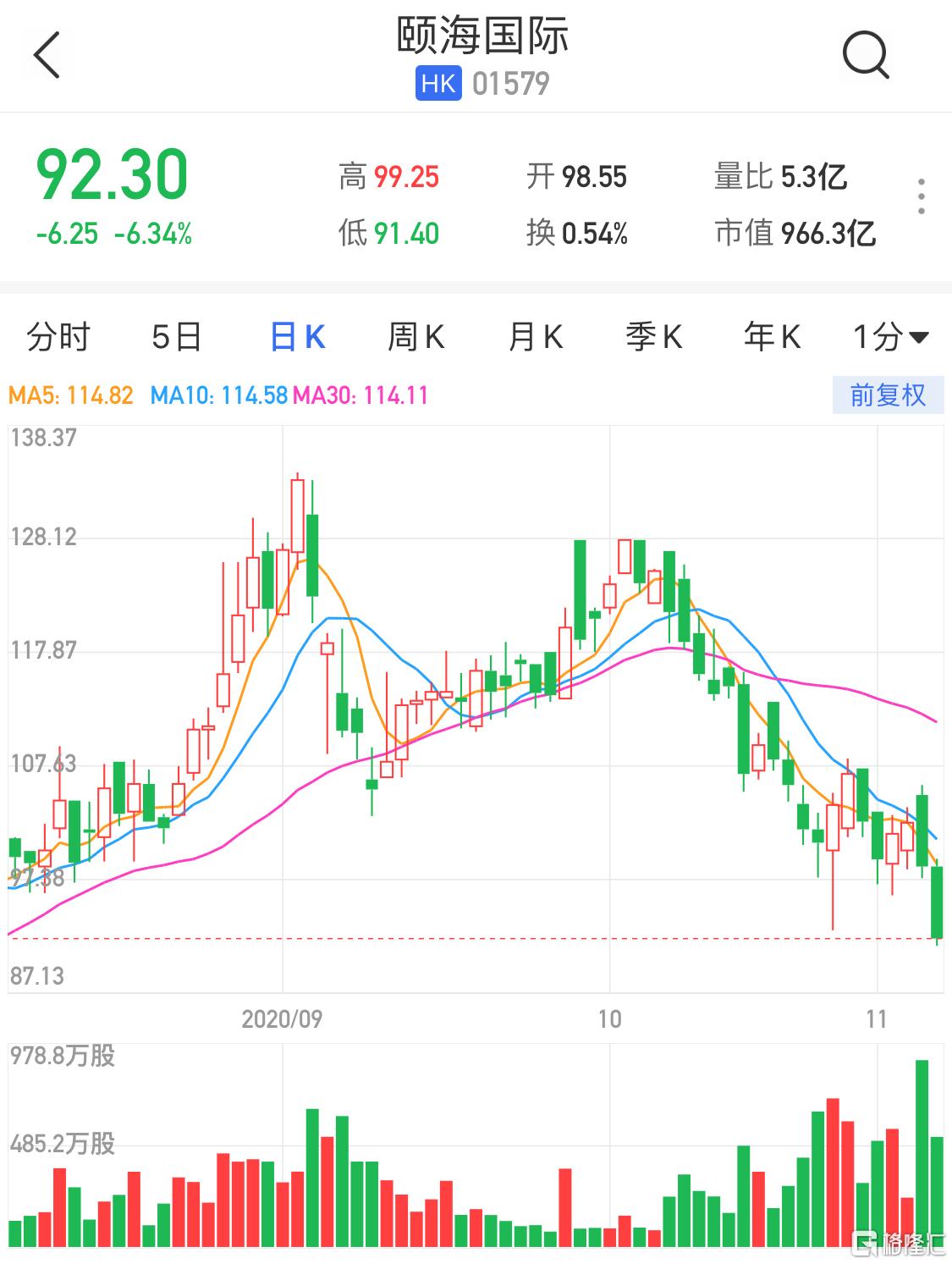 格隆汇11月6日丨颐海国际(1579.HK)近期持续走低,自历史高位已下挫超30%。现跌6.34%,报92.3港元创逾3个月新低价,暂成交5.3亿港元,总市值966.3亿港元。麦格理日前报告,称颐海国际与海底捞相关业务面临收入增长压力,且自热锅增长2021年或将放缓,将评级由“中性”调低至“跑输大市”,目标价由100港元降至79港元。另外,近日亦遭南下资金减仓,在11月2日港股通净卖出1.95亿港元。