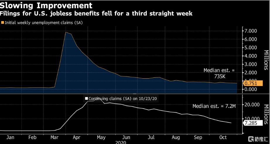 美国10月份制造业有所好转,但服务业增速降至五个月最低。截至10月31日的一周,美国初请失业金人数为75.1万,高于73.5万的预期值,暗示美国劳动力市场持续不稳定。
