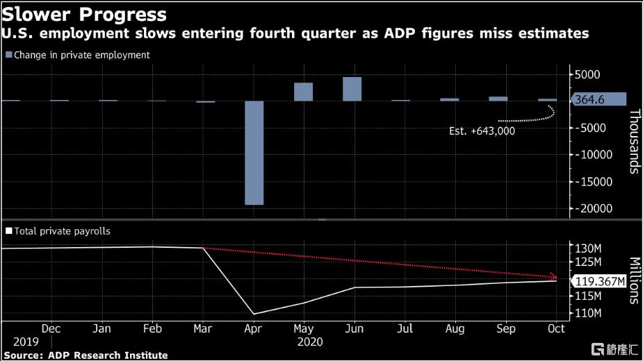 10月份美国公司新增就业数量少于预期,表明随着疫情继续对服务业构成拖累,缺乏额外的财政刺激措施正促使一些公司调整员工人数。北京时间11月4日21:15公布的数据显示,美国10月ADP就业人数增加36.5万,远远不及75.3万的前值和64.3万的预期值。招聘速度放慢表明,随着疫情继续减少服务企业(包括旅游,酒店和餐饮业)的收入,美国劳动力市场复苏之路仍很漫长。不及预期的ADP就业人数,加上近期疫情的反弹,凸显美国国会需要就新一轮财政援助达成协议,以支持受影响最严重的企业,保住就业岗位。