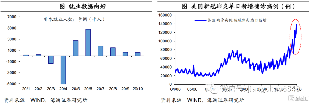 美国经济数据大多向好。9月批发销售环比增0.1%,低于预期和前值。工厂订单环比增长超预期,耐用品订单修正后环比符合预期。10月Markit服务业PMI创2015年4月份以来新高,综合PMI创2018年5月份以来新高;ISM制造业PMI连续5个月位于扩张区,非制造业PMI略有走低但仍位于扩张区。就业数据向好。10月季调后非农就业新增63.8万人;10月失业率为6.9%,连续六个月录得下滑;休闲和酒店、零售贸易、建筑以及专业和商业服务等多领域就业显著改善。至10月31日当周初请失业金人数为75.1万人,已连续三周低于80万人。