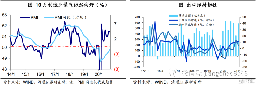 经济稳步复苏,生产需求指标向好。10月制造业PMI保持稳定,其中需求、生产指标均稳在高位,中观高频数据也指向经济平稳运行:一方面,终端需求好坏参半,去年同期高基数使得地产销量增速转负,但三四线地产销售仍在上行,而乘用车批发、零售销量增速也是稳中有升;另一方面,工业生产尚属稳健,样本钢企钢材产量增速稳定,主要行业开工率也是涨多跌少。