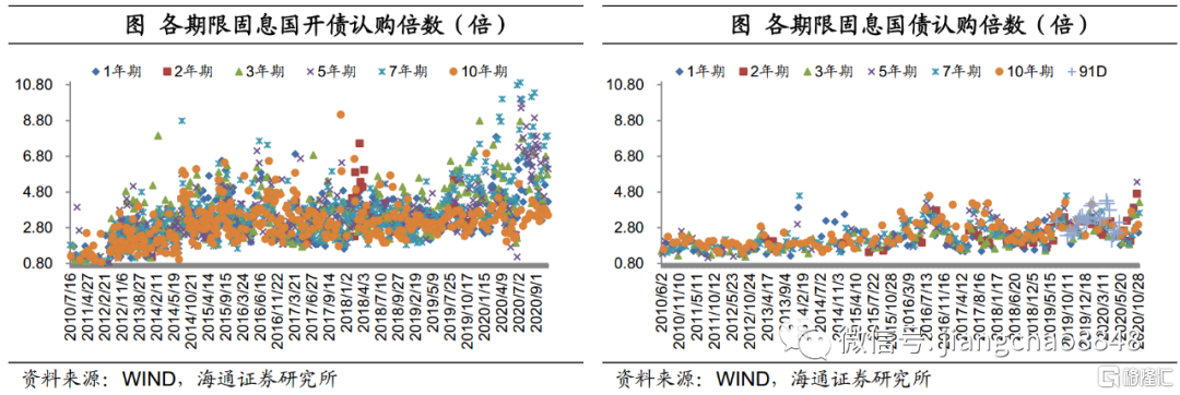 国开债需求整体尚可,认购倍数较好的品种有7年期和20年期,7年期20国开09(增15)认购倍数7.94倍,20年期20国开20(增11)认购倍数为7.6倍;其余品种认购倍数均在3.4倍以上,认购倍数尚可。