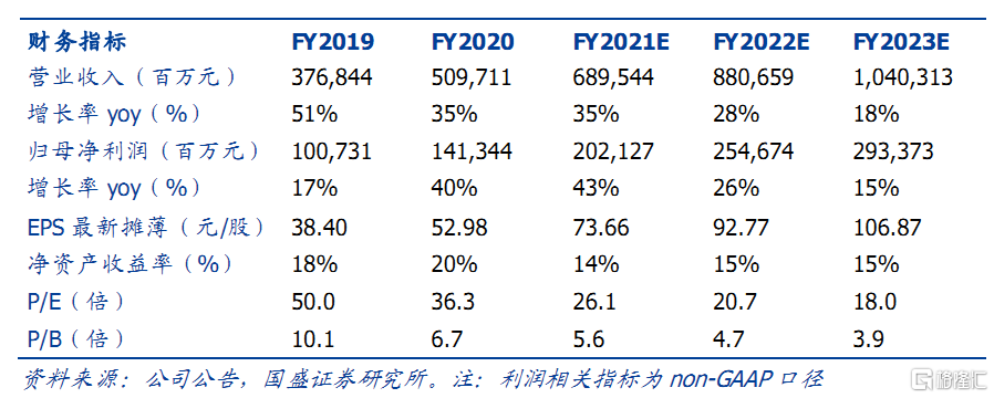 目标价 353港币,重申“买入”评级。我们预计阿里巴巴2021-2022财年收入增长35%/28%, 达6895/8807亿元; non-GAAP归母净利达2021/2547亿元。 基于核心电商20x 2022e P/E、云计算10x 2022e P/S、大文娱3x 2022eP/S、创新业务3x 2022e P/S,我们给予阿里巴巴353港币目标价,重申“买入”评级。